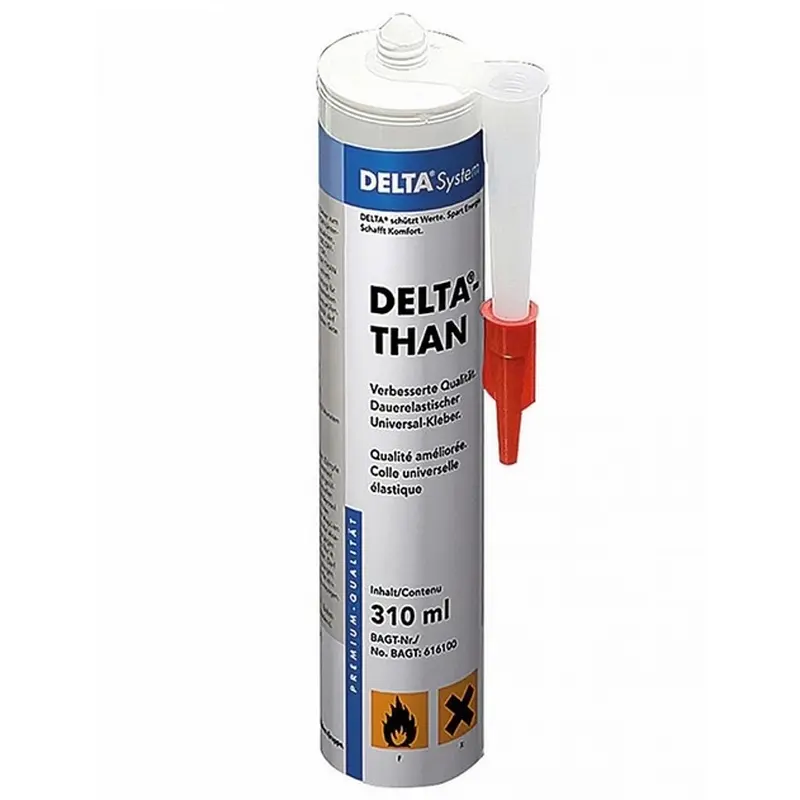 DÖRKEN DELTA-THAN je trvale pružné lepidlo na bázi speciálního kaučuku, které je nezbytné pro ty nejkritičtější venkovní spoje. Oproti lepicím páskám nabízí jedinečnou schopnost přemostění a vyplnění nerovností. Používá se pro spolehlivé lepení přesahů a napojení střešních fólií DELTA na drsné, minerální a porézní stavební podklady, jako je zdivo, beton nebo dřevo. Zajišťuje vodotěsnost spoje i v náročných podmínkách a je zárukou vysoké spolehlivosti v místech lepení.